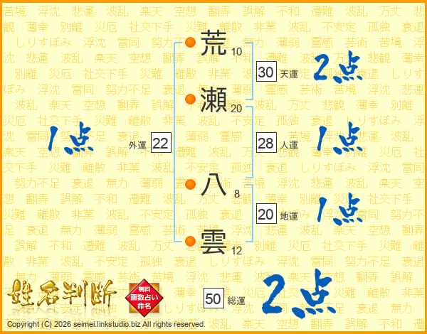 荒(10画)瀬(20画) 八(8画)雲(12画)