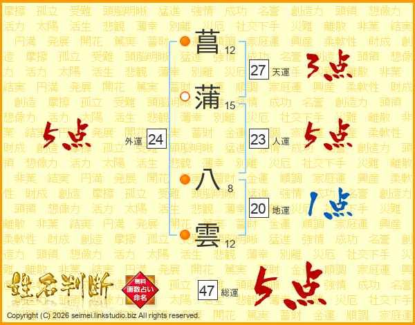 菖(12画)蒲(15画) 八(8画)雲(12画)