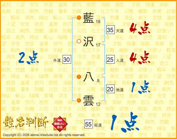 藍沢八雲さんの総運は55画の1点!