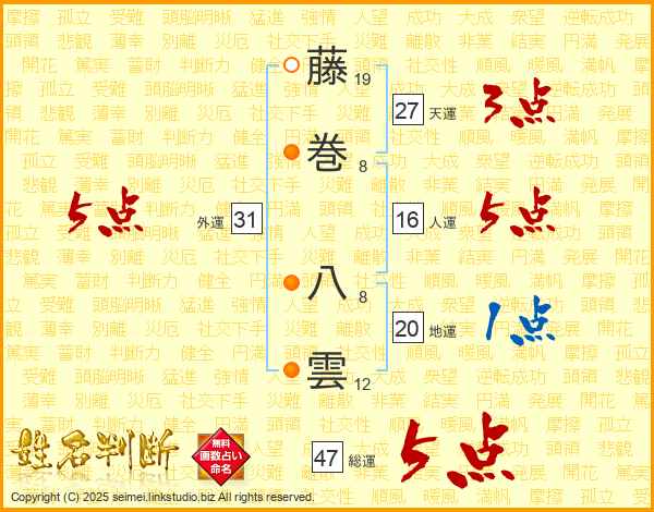 藤(19画)巻(8画) 八(8画)雲(12画)