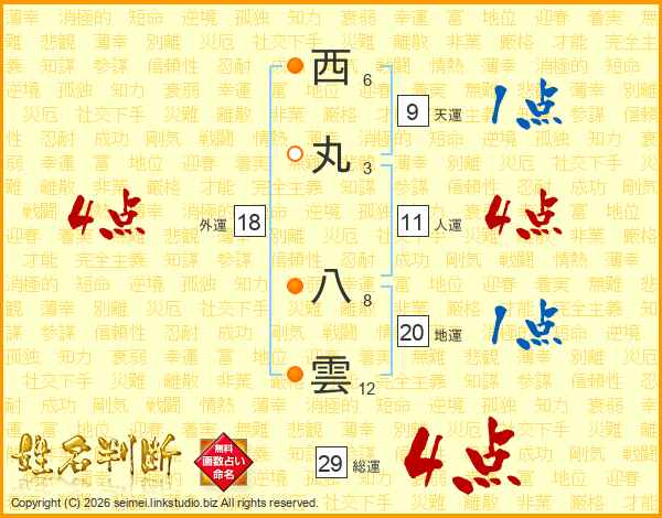 生活面を象徴する運勢です。外部から受ける影響力を表し、結婚運、家庭運や職場、環境への順応性を表します。総運から人運を引いた画数。姓や名が1文字の場合を除く。