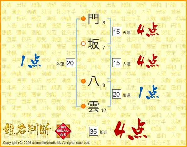 生活面を象徴する運勢です。外部から受ける影響力を表し、結婚運、家庭運や職場、環境への順応性を表します。総運から人運を引いた画数。姓や名が1文字の場合を除く。