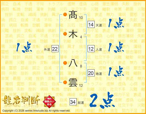 生活面を象徴する運勢です。外部から受ける影響力を表し、結婚運、家庭運や職場、環境への順応性を表します。総運から人運を引いた画数。姓や名が1文字の場合を除く。