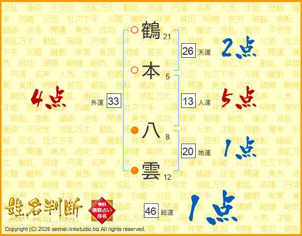 鶴(21画)本(5画) 八(8画)雲(12画)