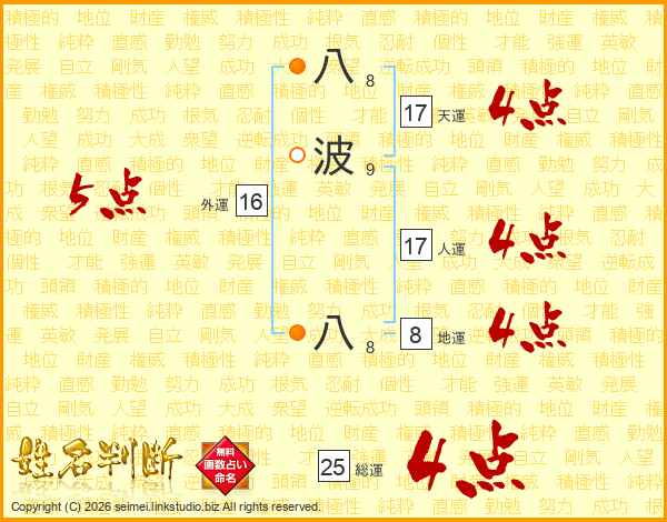生活面を象徴する運勢です。外部から受ける影響力を表し、結婚運、家庭運や職場、環境への順応性を表します。総運から人運を引いた画数。姓や名が1文字の場合を除く。