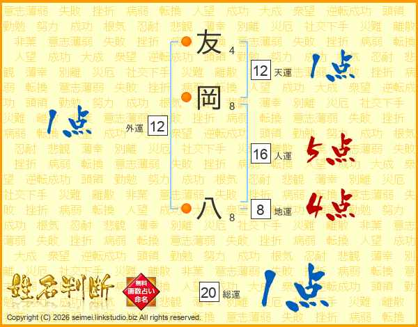 友岡八さんの人運は16画の5点!