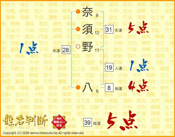 奈須野八さんの総運は39画の5点!