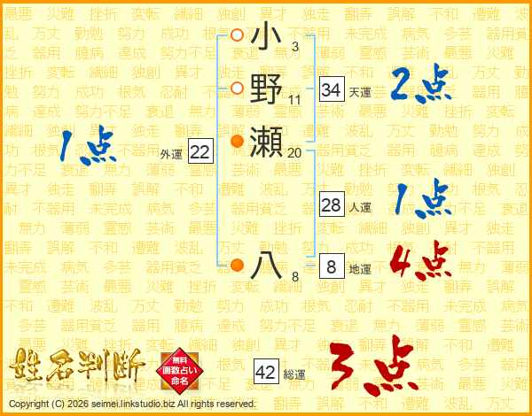 小野瀬八さんの総運は42画の3点!