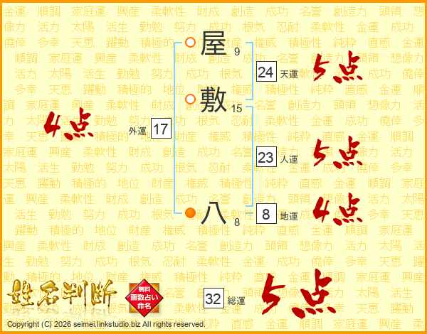 屋敷八さんの総運は32画の5点!