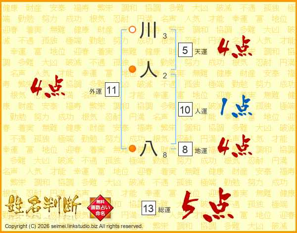 生活面を象徴する運勢です。外部から受ける影響力を表し、結婚運、家庭運や職場、環境への順応性を表します。総運から人運を引いた画数。姓や名が1文字の場合を除く。