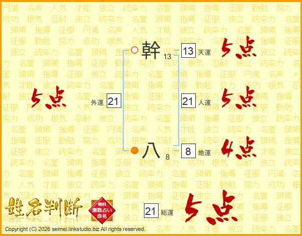 生活面を象徴する運勢です。外部から受ける影響力を表し、結婚運、家庭運や職場、環境への順応性を表します。総運から人運を引いた画数。姓や名が1文字の場合を除く。
