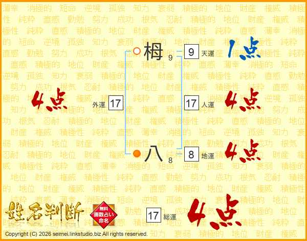 生活面を象徴する運勢です。外部から受ける影響力を表し、結婚運、家庭運や職場、環境への順応性を表します。総運から人運を引いた画数。姓や名が1文字の場合を除く。