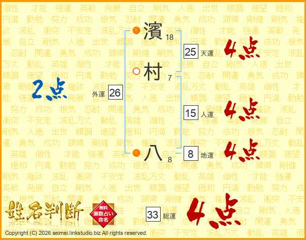 濱(18画)村(7画) 八(8画)