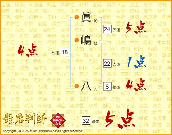 生活面を象徴する運勢です。外部から受ける影響力を表し、結婚運、家庭運や職場、環境への順応性を表します。総運から人運を引いた画数。姓や名が1文字の場合を除く。