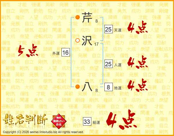 芹沢八さんの総運は33画の4点!