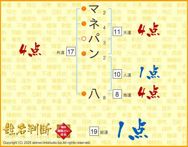 生活面を象徴する運勢です。外部から受ける影響力を表し、結婚運、家庭運や職場、環境への順応性を表します。総運から人運を引いた画数。姓や名が1文字の場合を除く。