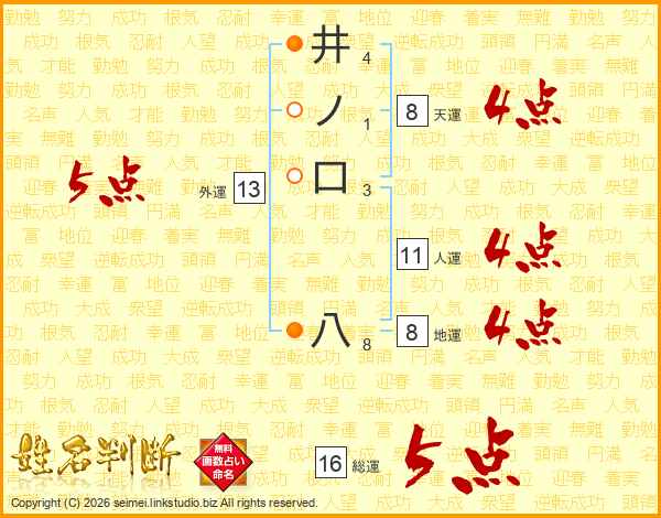 生活面を象徴する運勢です。外部から受ける影響力を表し、結婚運、家庭運や職場、環境への順応性を表します。総運から人運を引いた画数。姓や名が1文字の場合を除く。