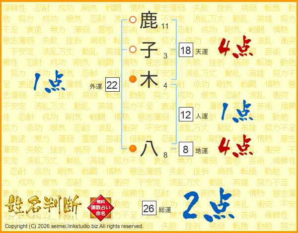 あなたの人生を表す1番重要な運勢です。生涯を通じて影響する総合運となり、主に50歳以降の晩年期に影響を及ぼします。苗字と名前の合計画数。