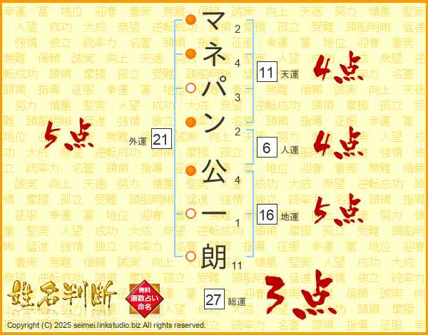 マ(2画)ネ(4画)パ(3画)ン(2画) 公(4画)一(1画)朗(11画)