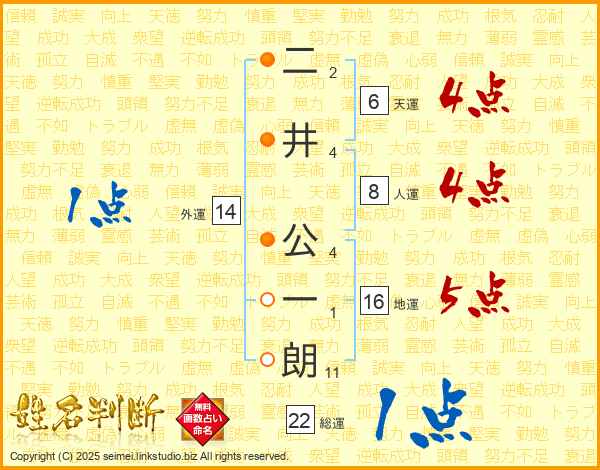 二(2画)井(4画) 公(4画)一(1画)朗(11画)
