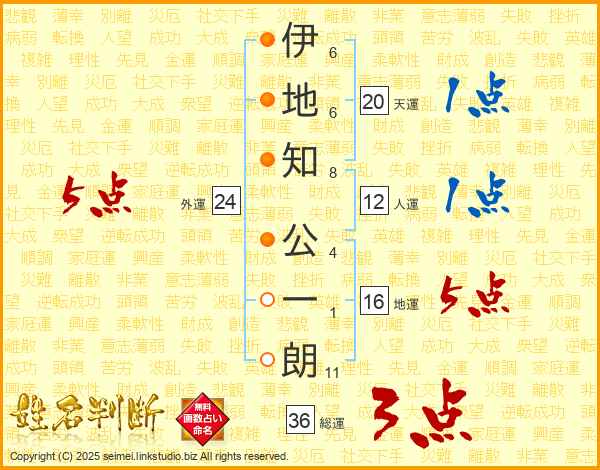 伊(6画)地(6画)知(8画) 公(4画)一(1画)朗(11画)