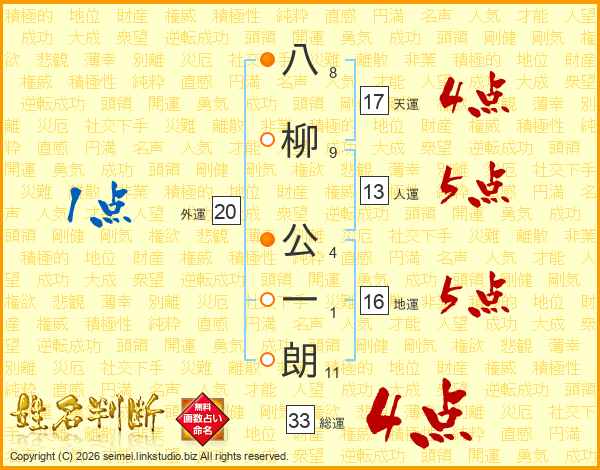 八(8画)柳(9画) 公(4画)一(1画)朗(11画)