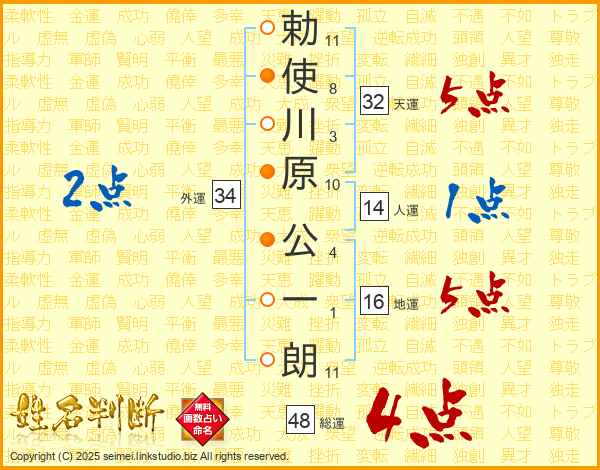 勅使川原公一朗さんの総運は48画の4点!
