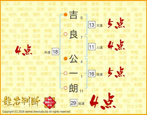 吉(6画)良(7画) 公(4画)一(1画)朗(11画)