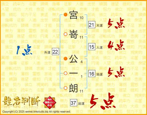 宮嵜公一朗さんの総運は37画の5点!
