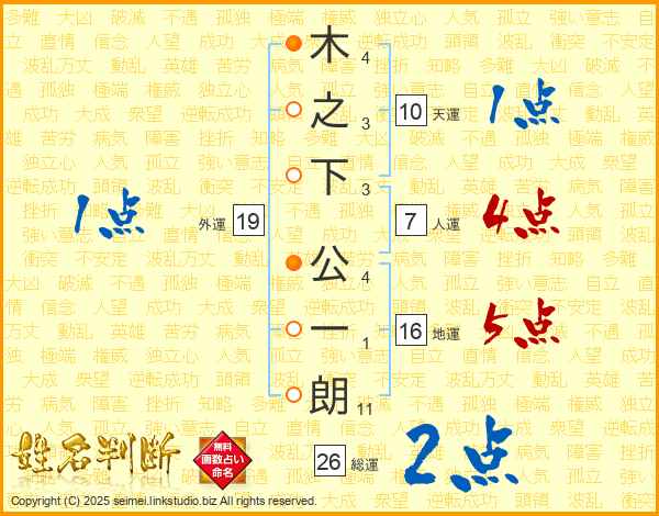 あなたの人生を表す1番重要な運勢です。生涯を通じて影響する総合運となり、主に50歳以降の晩年期に影響を及ぼします。苗字と名前の合計画数。
