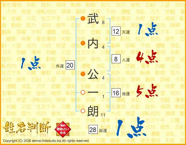 武(8画)内(4画) 公(4画)一(1画)朗(11画)
