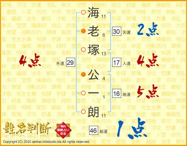 海(11画)老(6画)塚(13画) 公(4画)一(1画)朗(11画)
