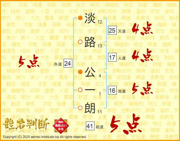 淡(12画)路(13画) 公(4画)一(1画)朗(11画)
