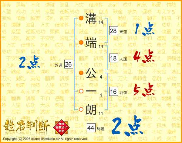 あなたの人生を表す1番重要な運勢です。生涯を通じて影響する総合運となり、主に50歳以降の晩年期に影響を及ぼします。苗字と名前の合計画数。