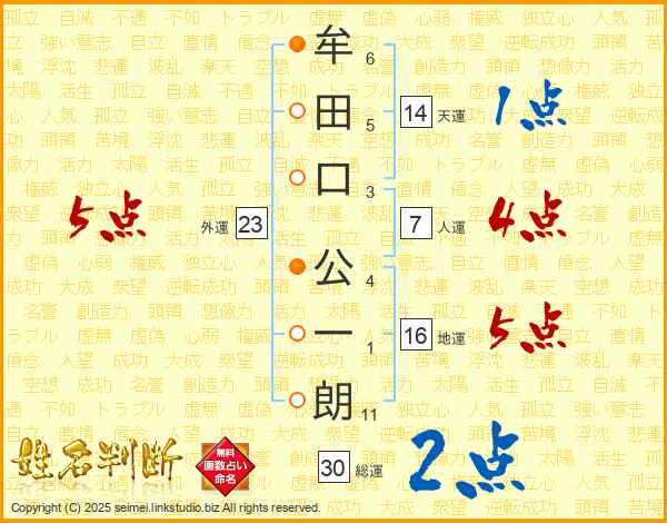 牟(6画)田(5画)口(3画) 公(4画)一(1画)朗(11画)