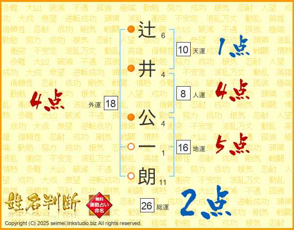 辻(6画)井(4画) 公(4画)一(1画)朗(11画)