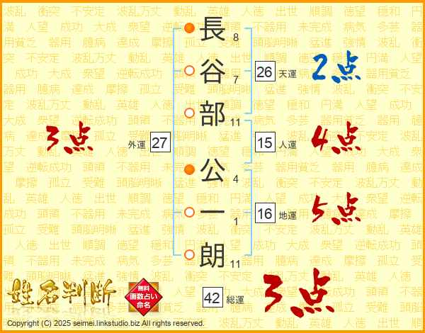 長(8画)谷(7画)部(11画) 公(4画)一(1画)朗(11画)