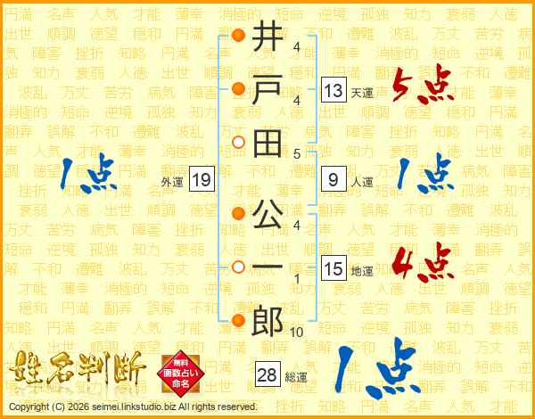 井(4画)戸(4画)田(5画) 公(4画)一(1画)郎(10画)