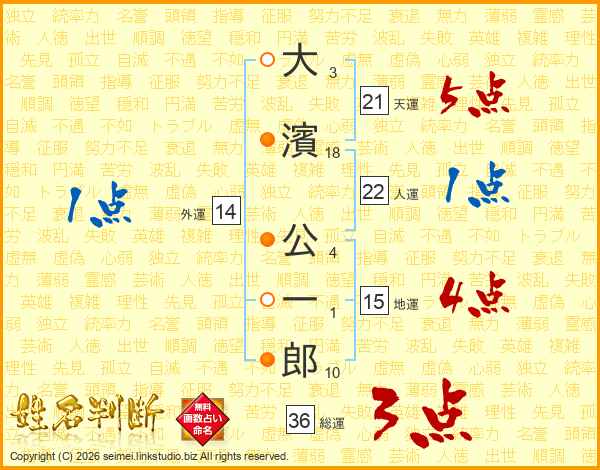 大(3画)濱(18画) 公(4画)一(1画)郎(10画)