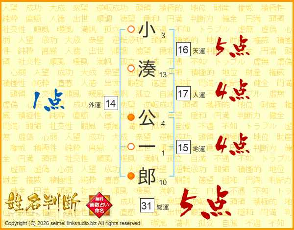 小(3画)湊(13画) 公(4画)一(1画)郎(10画)