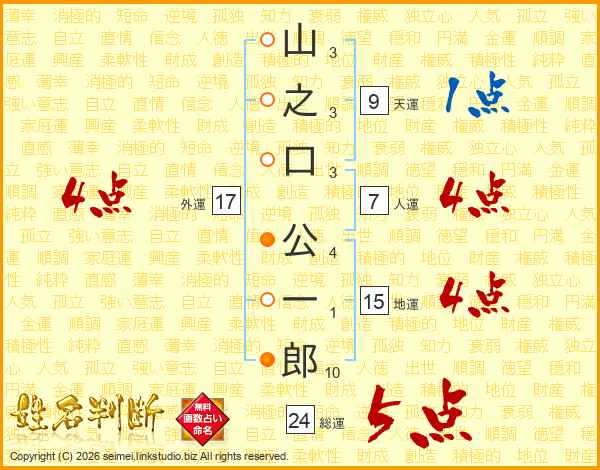 山(3画)之(3画)口(3画) 公(4画)一(1画)郎(10画)