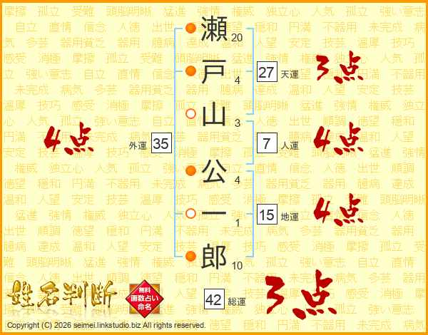 瀬(20画)戸(4画)山(3画) 公(4画)一(1画)郎(10画)
