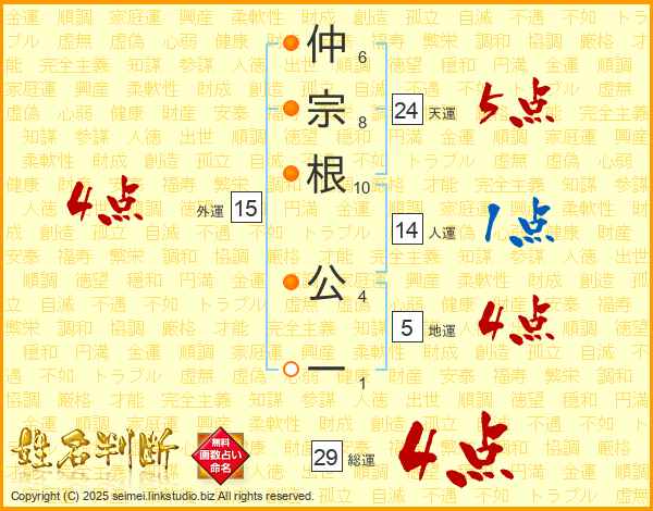 仲宗根公一さんの総運は29画の4点!