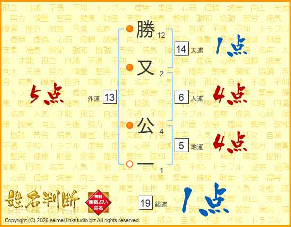 生活面を象徴する運勢です。外部から受ける影響力を表し、結婚運、家庭運や職場、環境への順応性を表します。総運から人運を引いた画数。姓や名が1文字の場合を除く。
