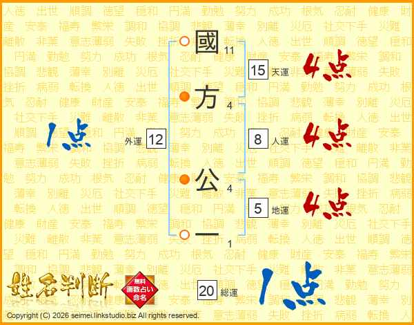 生活面を象徴する運勢です。外部から受ける影響力を表し、結婚運、家庭運や職場、環境への順応性を表します。総運から人運を引いた画数。姓や名が1文字の場合を除く。