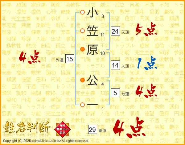 小(3画)笠(11画)原(10画) 公(4画)一(1画)