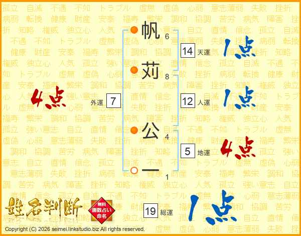 生活面を象徴する運勢です。外部から受ける影響力を表し、結婚運、家庭運や職場、環境への順応性を表します。総運から人運を引いた画数。姓や名が1文字の場合を除く。