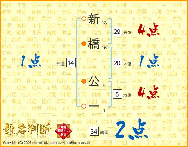 あなたの人生を表す1番重要な運勢です。生涯を通じて影響する総合運となり、主に50歳以降の晩年期に影響を及ぼします。苗字と名前の合計画数。