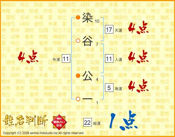 あなたの人生を表す1番重要な運勢です。生涯を通じて影響する総合運となり、主に50歳以降の晩年期に影響を及ぼします。苗字と名前の合計画数。