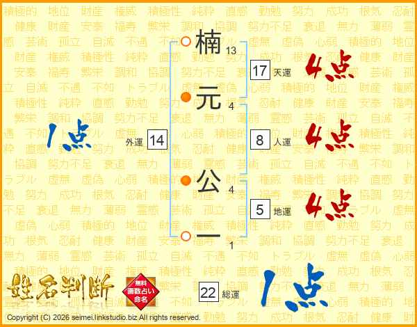 生活面を象徴する運勢です。外部から受ける影響力を表し、結婚運、家庭運や職場、環境への順応性を表します。総運から人運を引いた画数。姓や名が1文字の場合を除く。